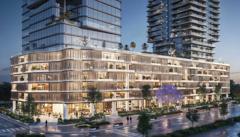 A shared podium connects both towers, offering retail, 439 parking spaces, and landscaped leisure areas for residents and professionals.