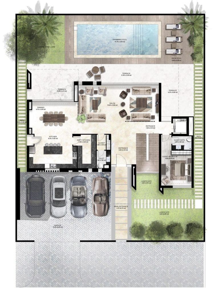 ستأتي مساكن G + 1 + R الفاخرة مع العديد من التراسات حيث يمكنك ترتيب مناطق للاسترخاء والتجمع مع الأصدقاء. ستحتوي الحديقة الخاصة في كل فيلا على مسبح مع سطح وستشمل المساكن أيضاً مساحات معيشة ومطبخ للتحضير والعرض وأماكن لوقوف السيارات وغرفة خادمة ومصعد.