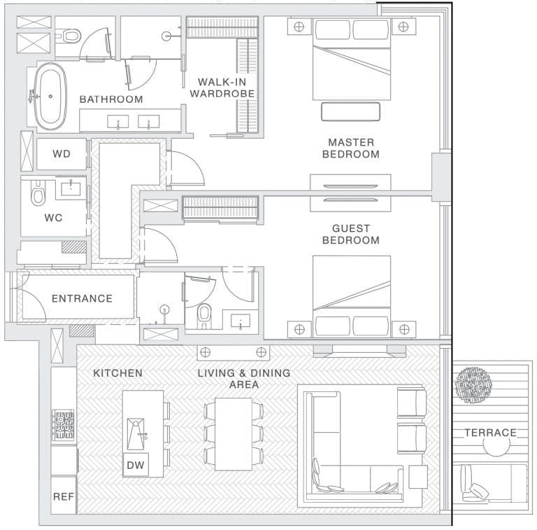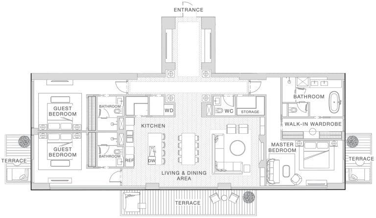 Квартиры дополнены просторной террасой, гардеробной и отдельной комнатой для гостей. Из панорамных окон открывается живописный вид на песчаный пляж и водную гладь Арабского залива.