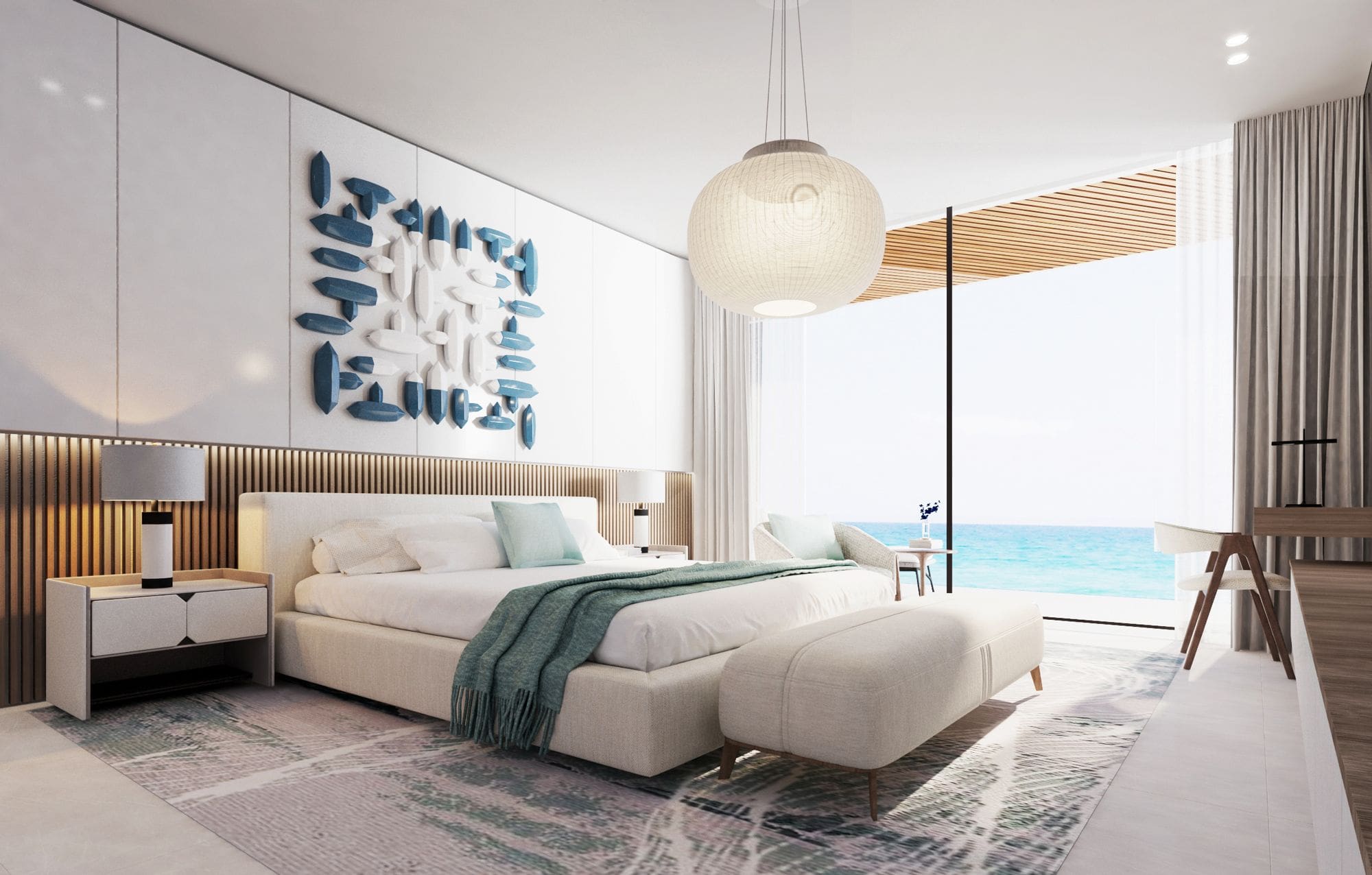 Резиденции оформлены с применением бело-земляной палитры с вкраплением оттенков синего, чтобы обеспечить эффект бесконечности и плавный переход между внутренним и внешним пространством. Из всех резиденций будет открываться удивительный вид на кристально чистые воды Арабского залива.