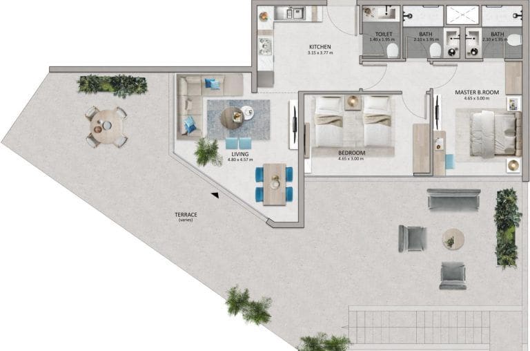 В проекте предлагаются студии, junior-апартаменты и лофты с одной спальней, таунхаусы с 2–3 спальнями, апартаменты и дуплексы с 1–3 спальнями. Их площадь варьируется от 47 кв. м до 416 кв. м.