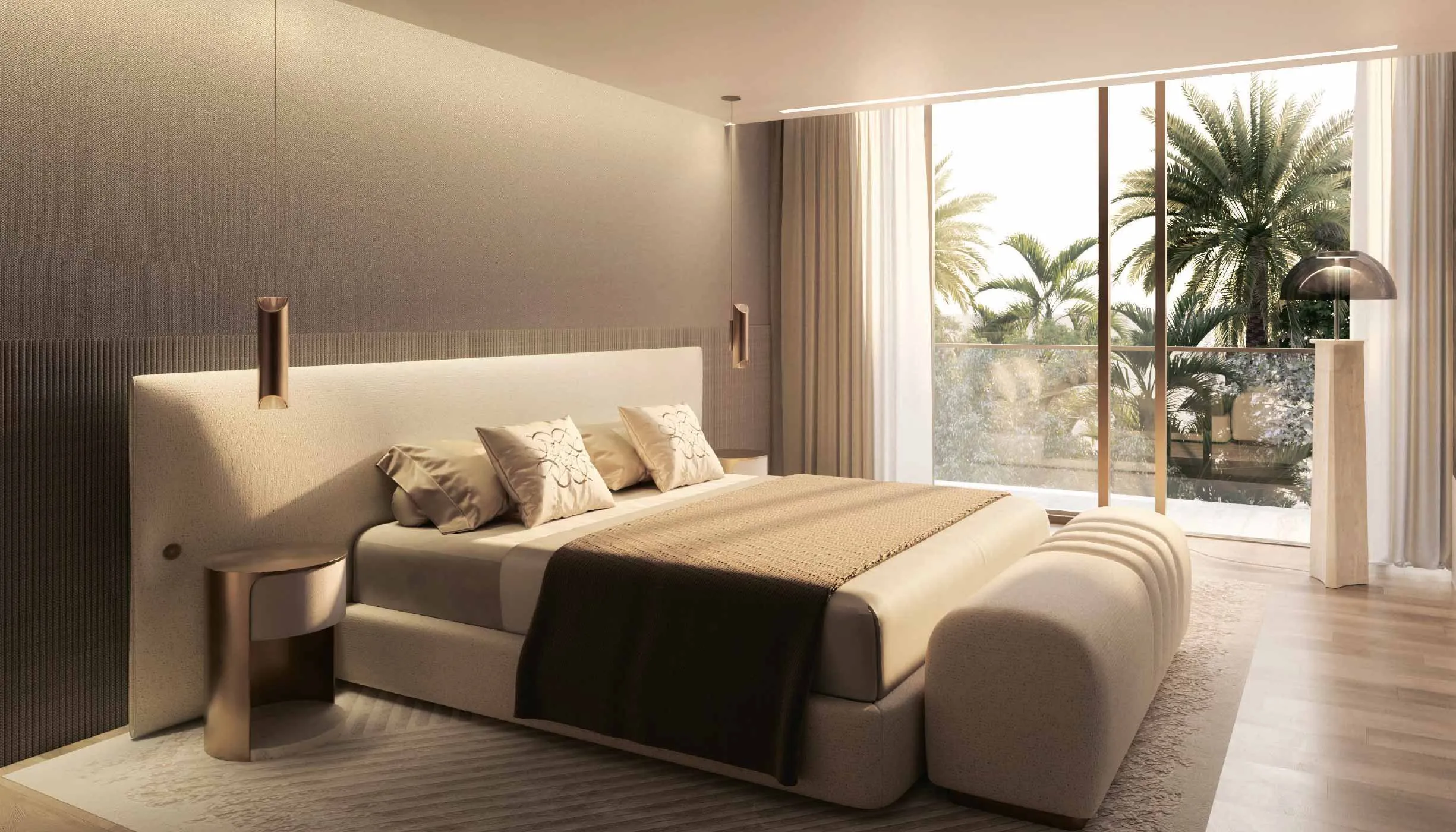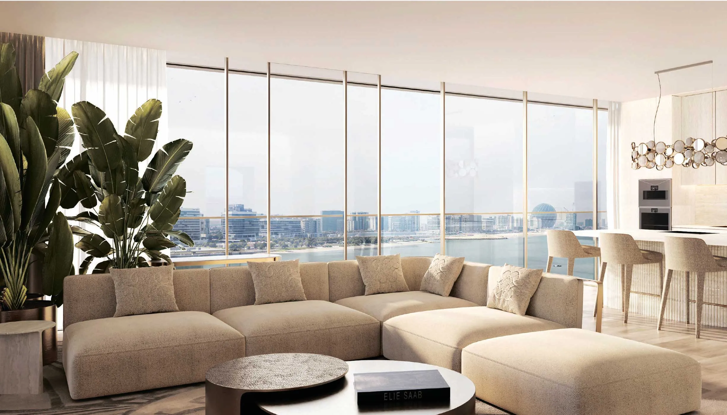 Yas Bay location, sea and parkland views. The promenade and dining are steps away. Interiors use Elie Saab Maison vocabulary — warmth, geometry, light.