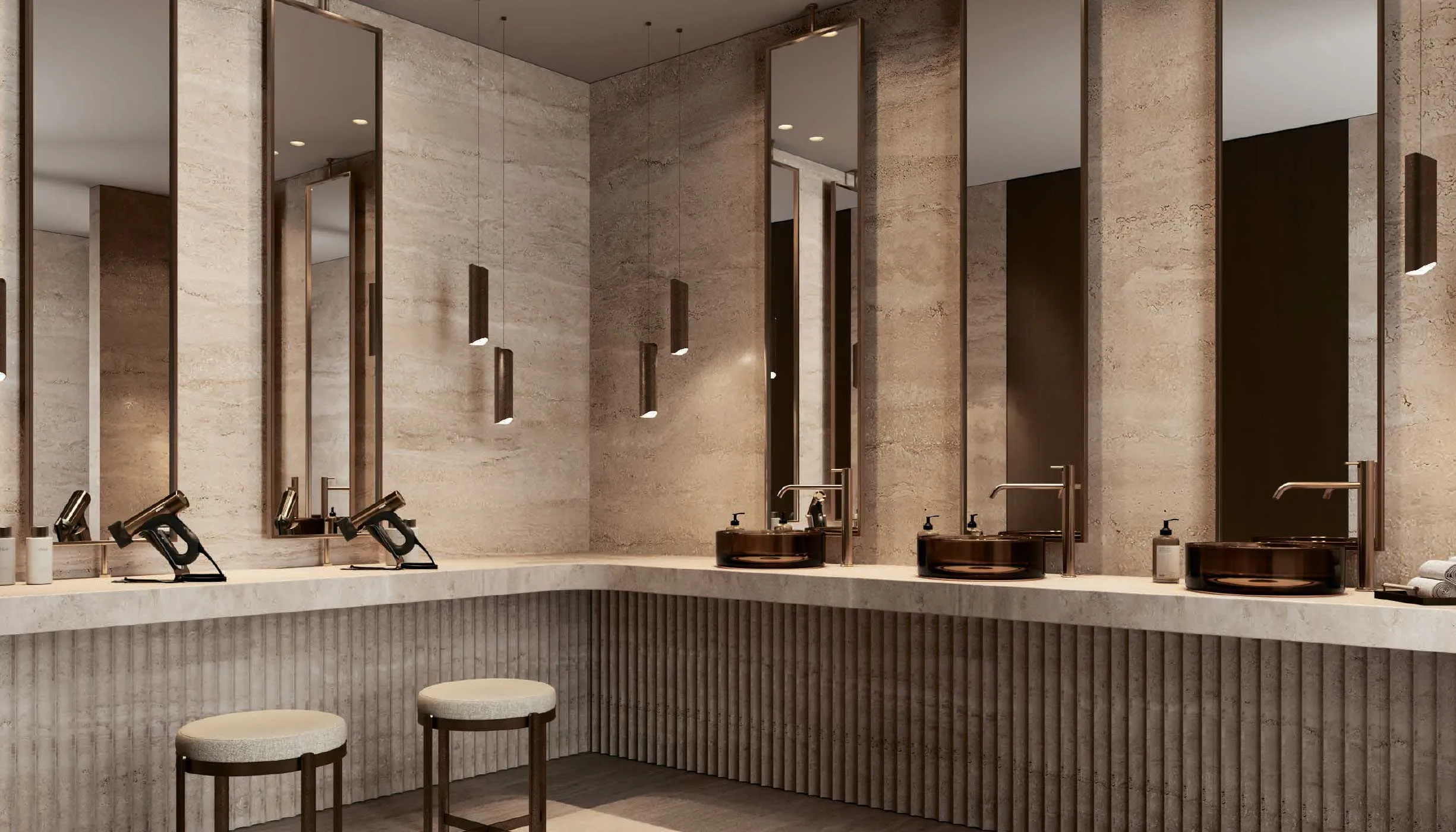 The tower includes infinity pools, yoga zones, landscaped gardens, cinema, lounges, and direct access to Crest Park. Wellness spaces sit alongside social areas — designed for use, not just show.