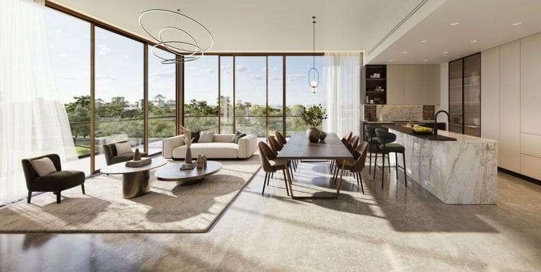 Sama Yas offers 2-3 bedroom apartments, some of which have garden access, and 2-3 bedroom duplexes. Each home has an equipped kitchen, a powder room, dressing rooms in the bedrooms and a laundry room. Some 2-3 bedroom apartments have a staff room with a private bathroom. Harmonious colour schemes and exclusive décor elements from Woods Bagot and Mustard & Linen give a special cosiness to the apartments. Floor-to-ceiling windows and balconies offer picturesque views of the park or the island landscape.